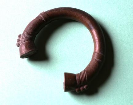 Those who were present when Julian Ticehurst gave his illustrated presentation on odd and curious currency in May of this year will remember seeing horseshoe-shaped bracelets called Manillas. The name comes from the Spanish and Portuguese word for a bracelet. This odd form of currency originated in Calabar, Nigeria, in the late 1400s. It then spread throughout West Africa. The illustration shows a Nigerian-made manilla, cast in bronze. It is extremely heavy. Light-weight ones were called Popos, but there was a variety of names for manillas in the different African languages. The British, French, and Dutch who traded with West Africa realized that they could make manillas cheaply and use them to buy slaves. In 1505 a male slave could be bought with eight to ten manillas. By adding lead and zinc, the bronze could be given a golden tone. These foreign-made manillas were a simple U shape with oval, trumpet-like ends. African-made manillas, like this one, are patterned and have more complex ends. Sometimes they were made with twisted wire. Manillas could be worn on the wrists as a sign of wealth. Their career as money ended in the 1940s. Old manillas are still being sold as ornamental bangles or bracelets. They have made the transition from money to just jewellery.